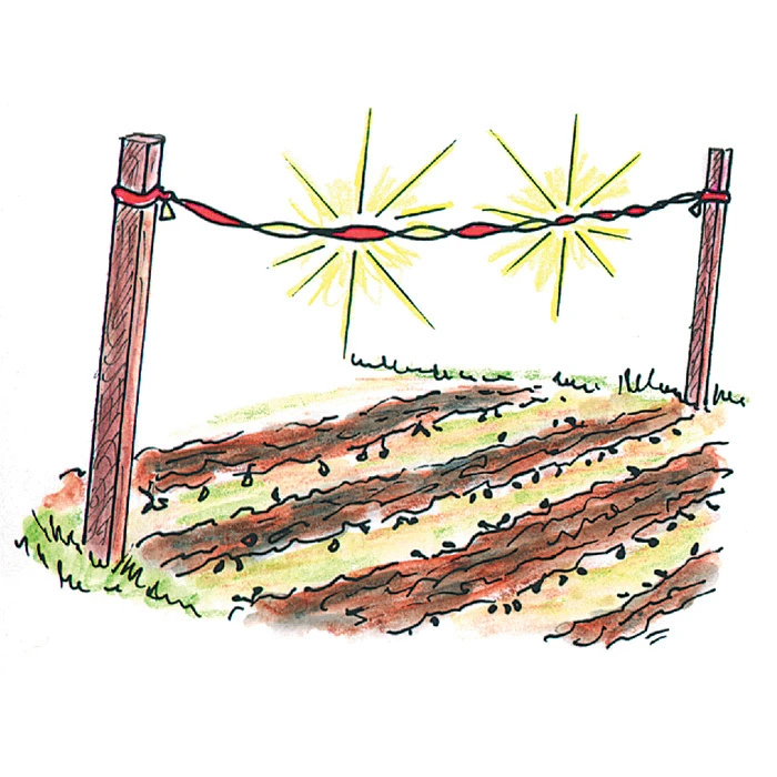 Protect gardens from thieving birds. The holographic images printed on this reflective ribbon flash dramatically in sunlight as the tape vibrates in the wind. Ideal for fruit trees, berry patches and grapevines. Stretch between stakes or posts (not included). Made in the USA. ¾” wide x 100′ roll.